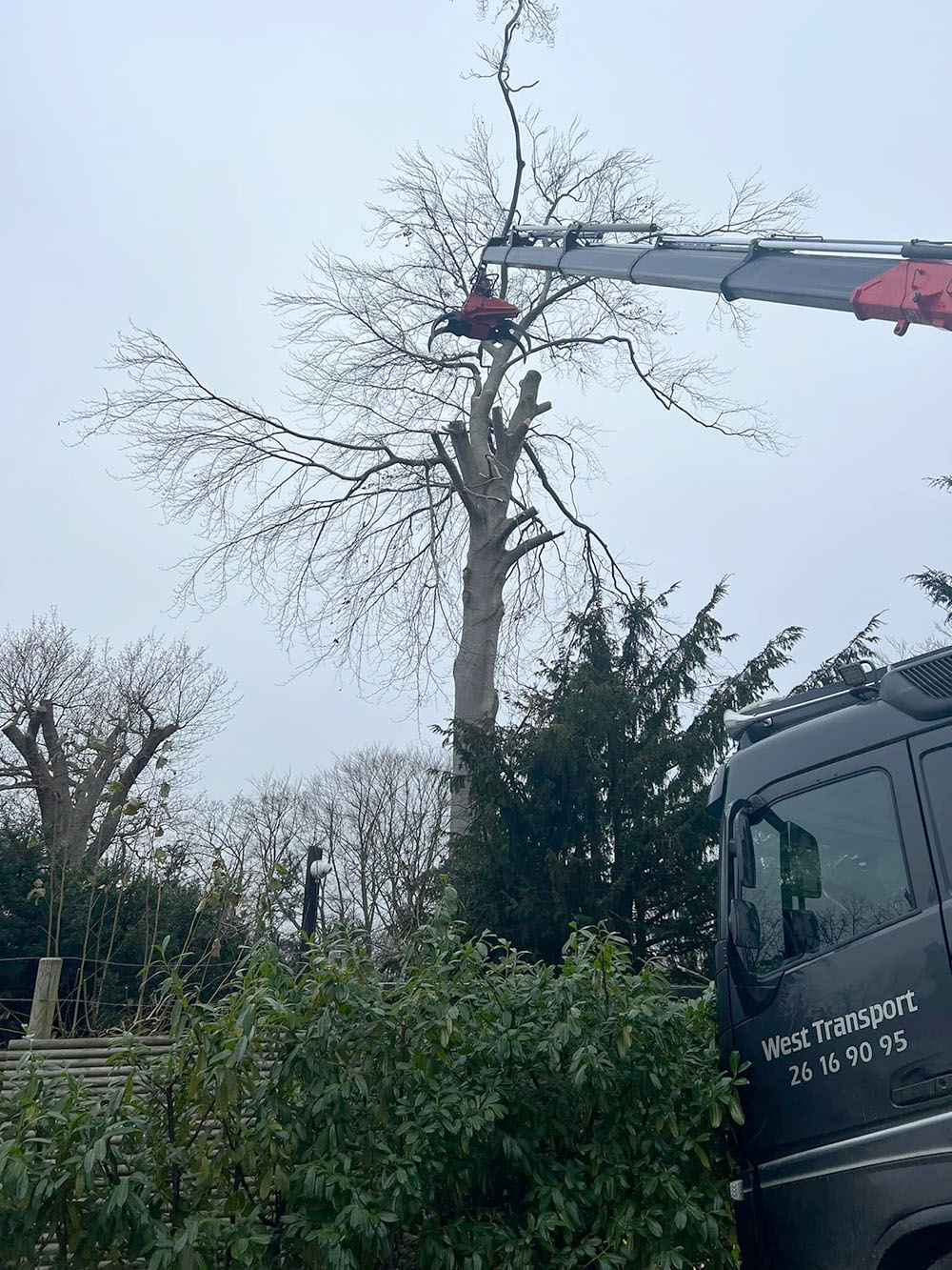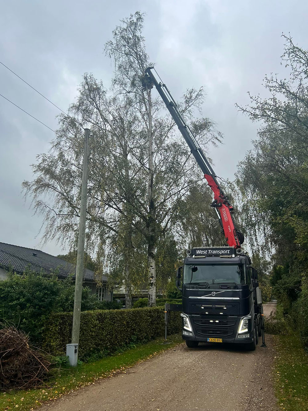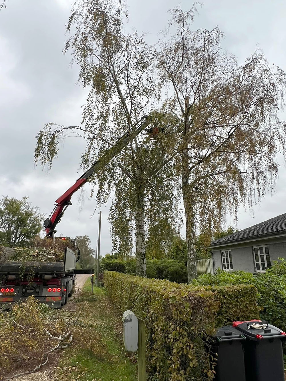 Når vi fælder træer med fældegrab kan vi tage meget store gren sektioner af gangen - nogle gange hele træer. Samtidig kan vi lægge grene (og stammer) direkte i containteren på ladet, så der er ryddet pænt op.