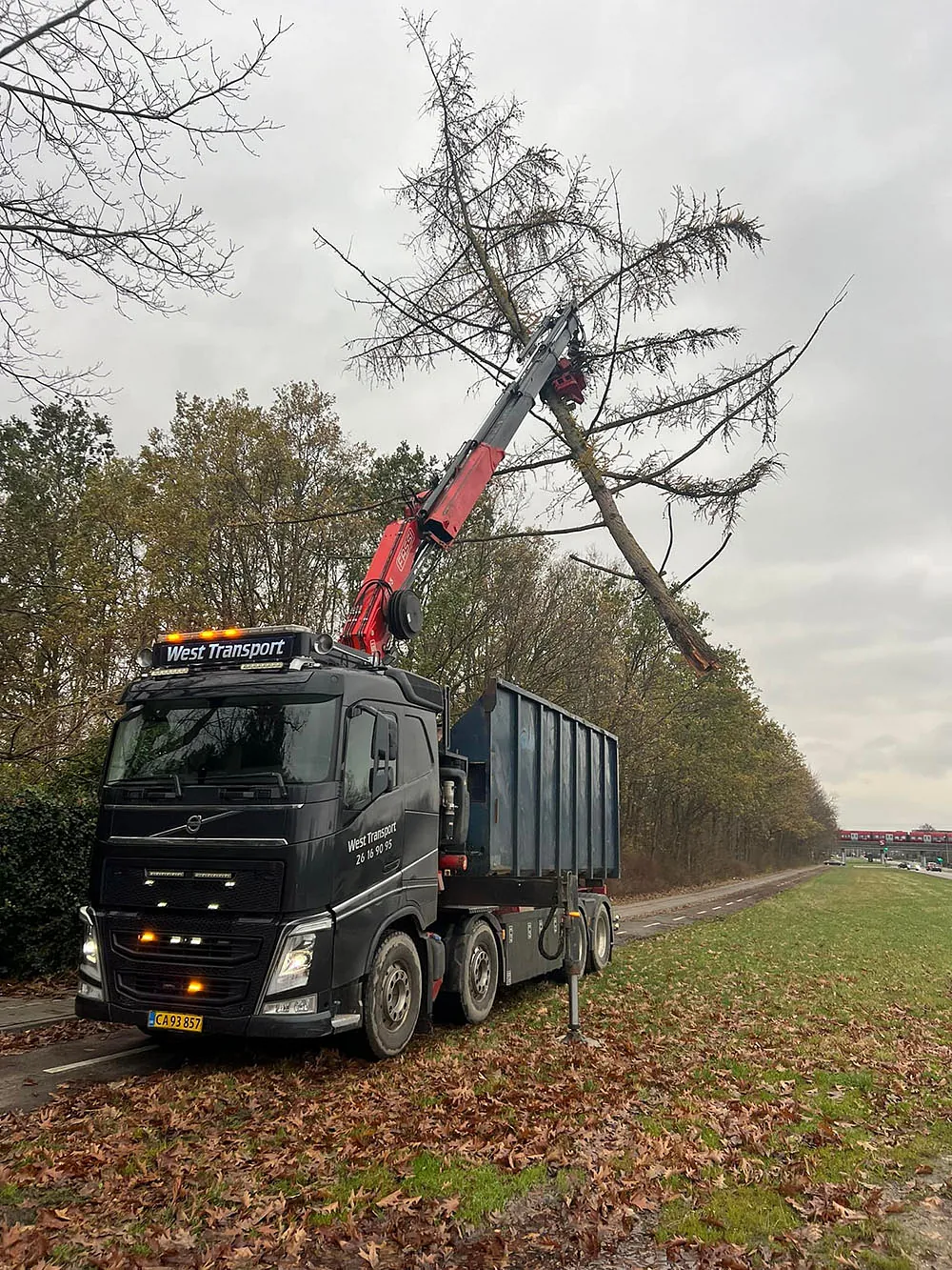 Når vi fælder træer med fældegrab kan vi tage meget store gren sektioner af gangen - nogle gange hele træer. Samtidig kan vi lægge grene (og stammer) direkte i containteren på ladet, så der er ryddet pænt op.